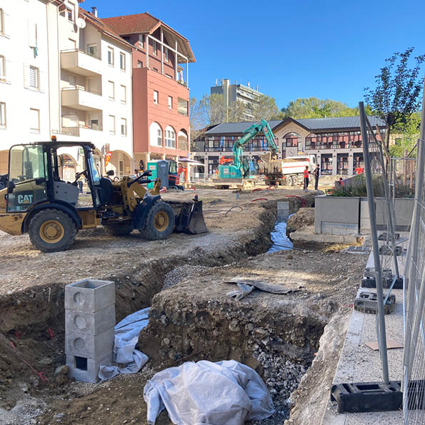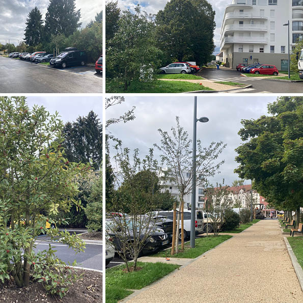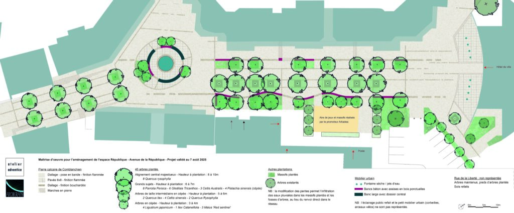 L’étude de faisabilité pour l’espace République réalisée en 2024 comportait les propositions d’aménagement pour le parking de la Poste et de l’Hôtel de Ville, réalisé d’une part par le promoteur Arkadea dans le cadre du programme immobilier « le Magnifique » et d’autre part par la commune. Cet aménagement anticipe le projet de réaménagement de l’avenue piétonne et les futures entrées du parc. Les plantations sont réalisées en cohérence avec le projet d’ensemble.