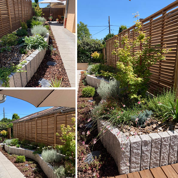 La conception du jardin, avec sa courbe de granit, emmène l’œil et agrandit le jardin, apportant de la légèreté et du contraste avec la linéarité du jardin. Les panneaux de bois ajoutent une note chaleureuse et graphique ainsi qu’un jeu de lumière. Les plantations poussent et s’adaptent à l’espace, et vont poursuivre leur développement…